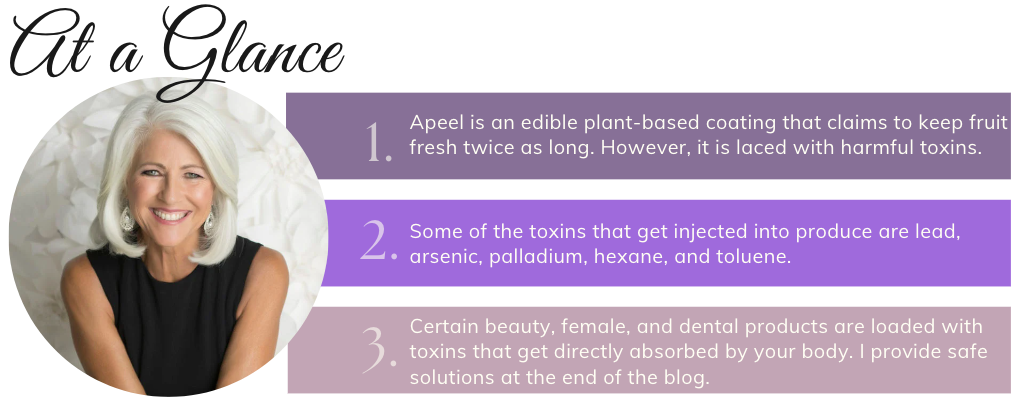 I first learned about Apeel [1]’s toxic produce coating from the Deep Roots at Home blog [2] and continued to investigate further. The food you choose to fuel your body has one of the biggest impacts on your healing journey, which is why Essential #1 (of my 7 Essentials System® [3]) is Let Food Be Your Medicine. But sadly, even universally agreed upon known “healthy foods” such as fresh fruits and vegetables can be laced with toxins. This is why you should investigate everything, as I like to do.