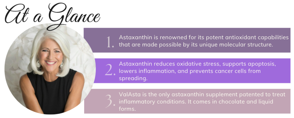 ValAsta is a superfood that can be beneficial for everyone. It’s a powerful antioxidant and anti-inflammatory, prevents free radical damage (a major cause of ailments and dis-eases), provides anti-aging support, and so much more. Like Samuel, YOU can take control of your health and heal with education and a strategy aligned with evidence-based therapies and supplements. My online program [18], Conquering Breast Cancer Together, A Balanced Approach to YOUR Healing Journey, provides a step-by-step guide and realistic action steps to move you forward.