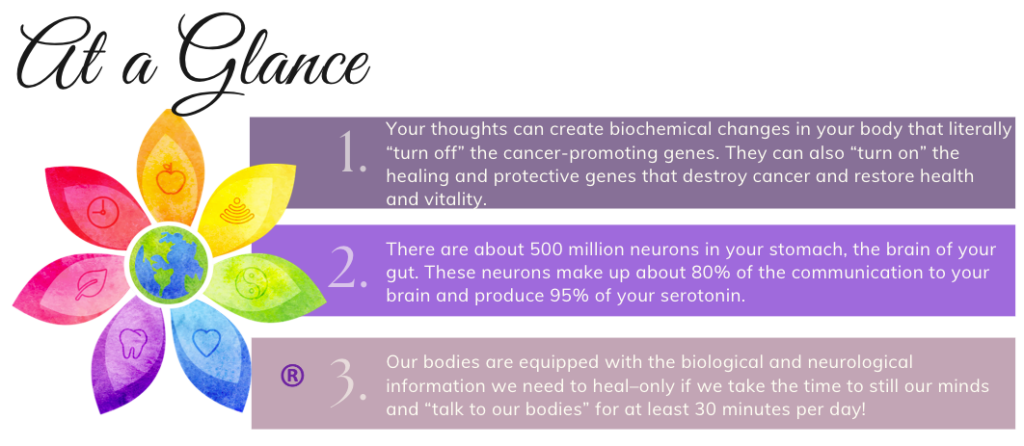 Your thoughts can create biochemical changes in your body that literally “turn off” the cancer-promoting genes. They can also “turn on” the healing and protective genes that destroy cancer and restore health and vitality. Your thoughts and beliefs are a major part of the healing process since they can change your body chemistry.