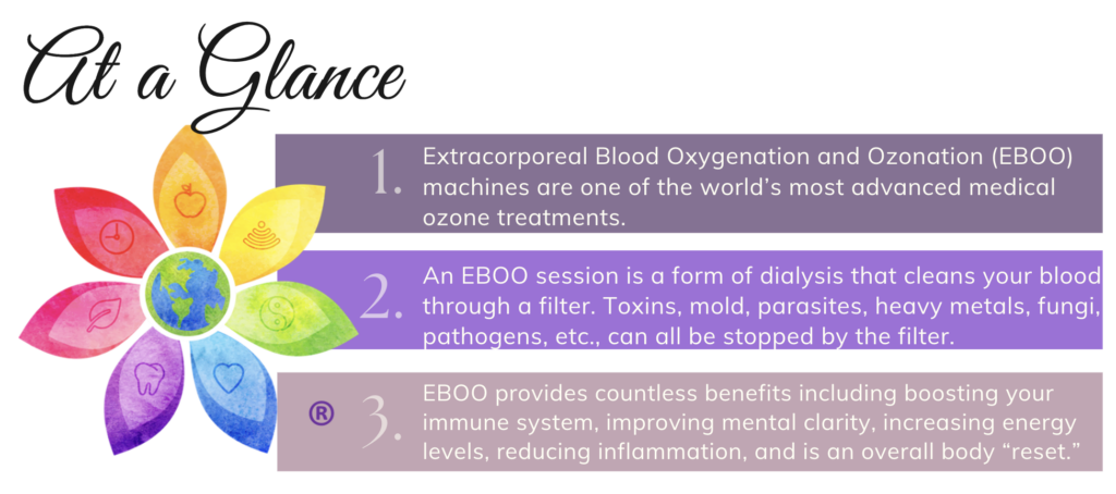 EBOO heals your body in a myriad of ways, and most people will greatly benefit from even a single treatment. In short, an EBOO session is a form of dialysis that cleans your blood through a filter. Toxins, mold, parasites, heavy metals, fungi, pathogens, etc., can be cleaned up by the filtration system.