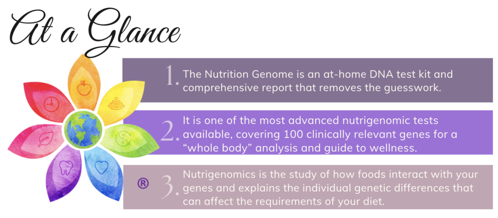 The Nutrition Genome [2] is an at-home DNA test kit and comprehensive report that removes the guesswork. It is one of the most advanced nutrigenomic tests available, covering 100 clinically relevant genes for a “whole body” analysis and guide to wellness. This test dives deep and provides clear and actionable results. It was a game-changer in my healing journey. No more stressing at the grocery store about what I should or shouldn’t buy.