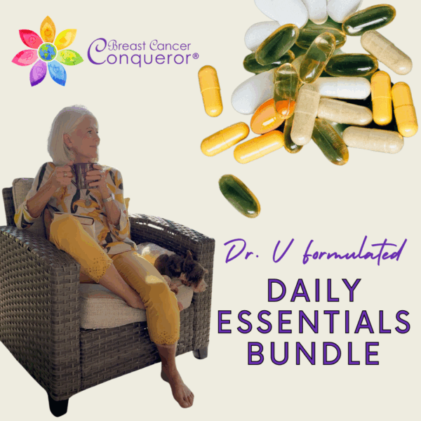 Created and formulated by Dr. Veronique Desaulniers (Dr. V)—founder of the 7 Essentials System® and a pioneer in integrative breast cancer healing—this bundle delivers the five foundational supplements your body needs each day to thrive. Designed to strengthen immunity, balance hormones, restore cellular vitality, and support gut health, the Daily Essentials Bundle is the perfect first step for anyone beginning, or continuing, their breast healing journey.