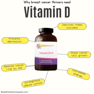 - Vitamin D+K. Vitamin D+K is critical for breast cancer healing and almost every aspect of your health. It strengthens bones, stops the growth of breast cancer cells, optimizes mood and energy, boosts the immune system, and provides all sorts of other sunny benefits that you can learn about via this blog post.