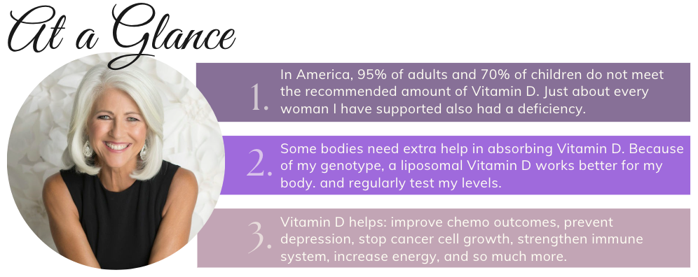 Vitamin D is critical for breast cancer healing and almost every aspect of your health. It’s the ONE vitamin that most Americans are low in, and it plays a massive role in your overall health: